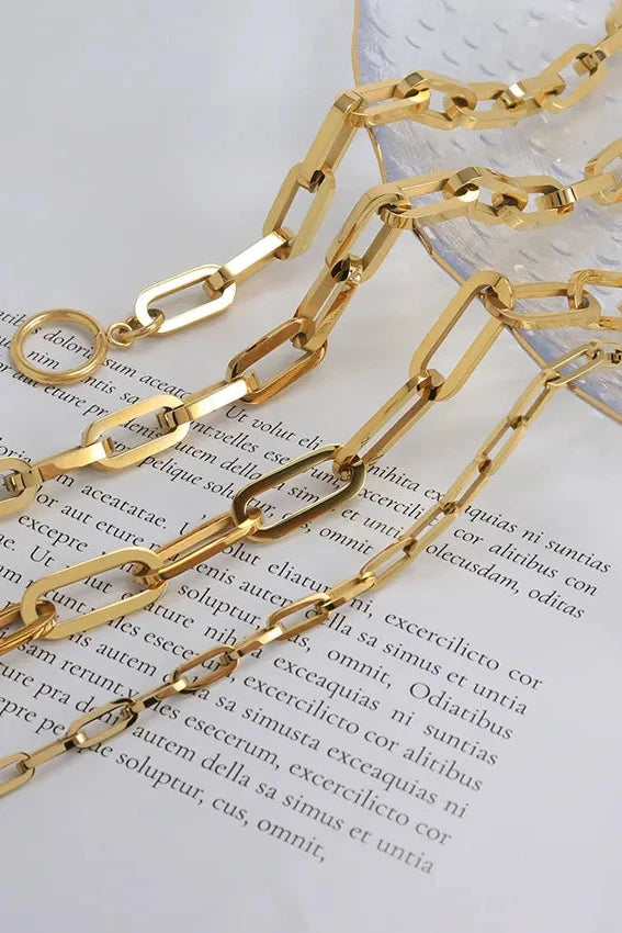 Elevate your accessory game with our Bold Luxe Paperclip Chain Necklace Collection – a modern twist on timeless elegance. Crafted from high-quality stainless steel and finished in radiant 18K gold plating, each necklace showcases a sleek, geometric paperclip design that blends strength with sophistication.