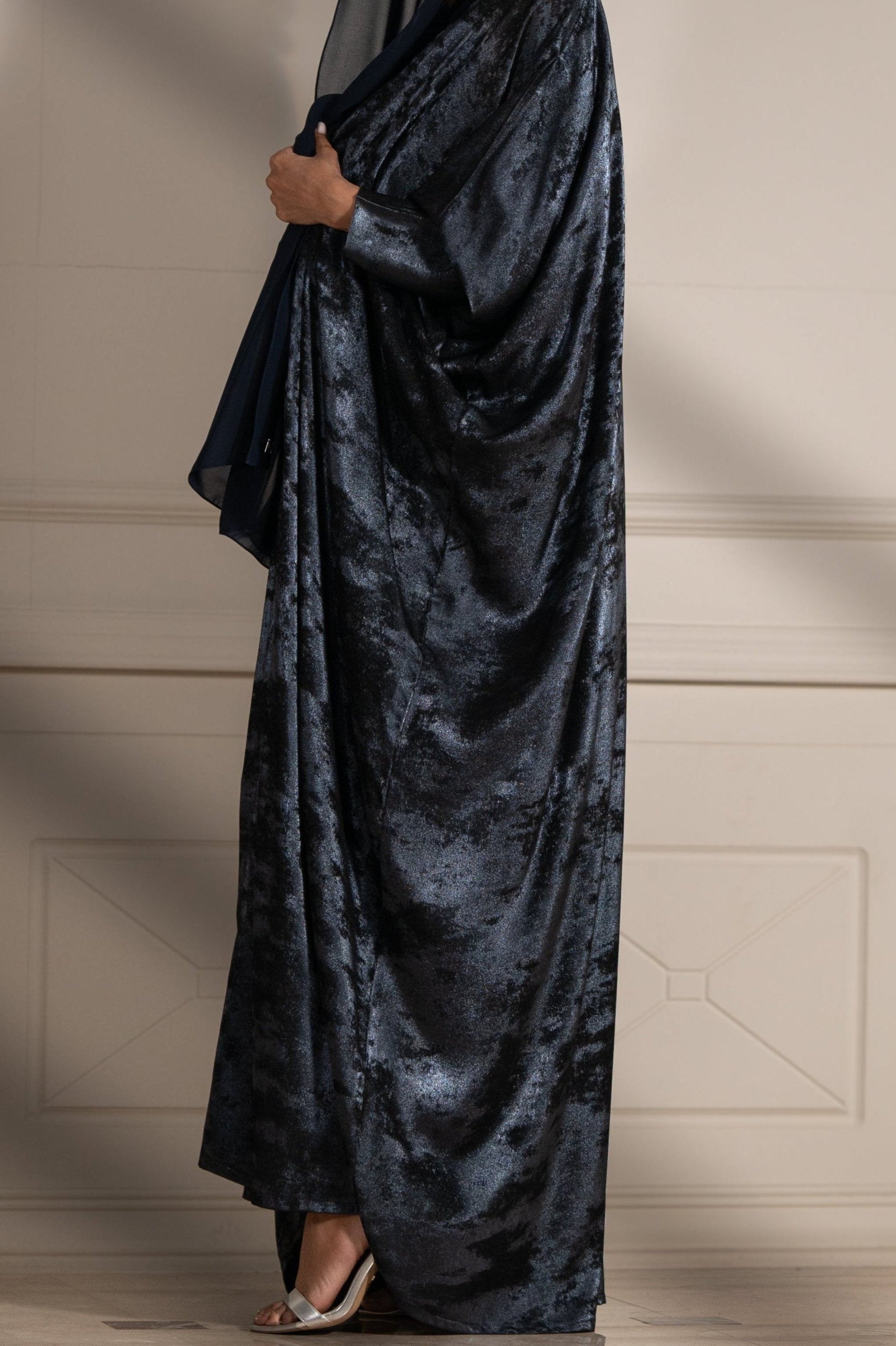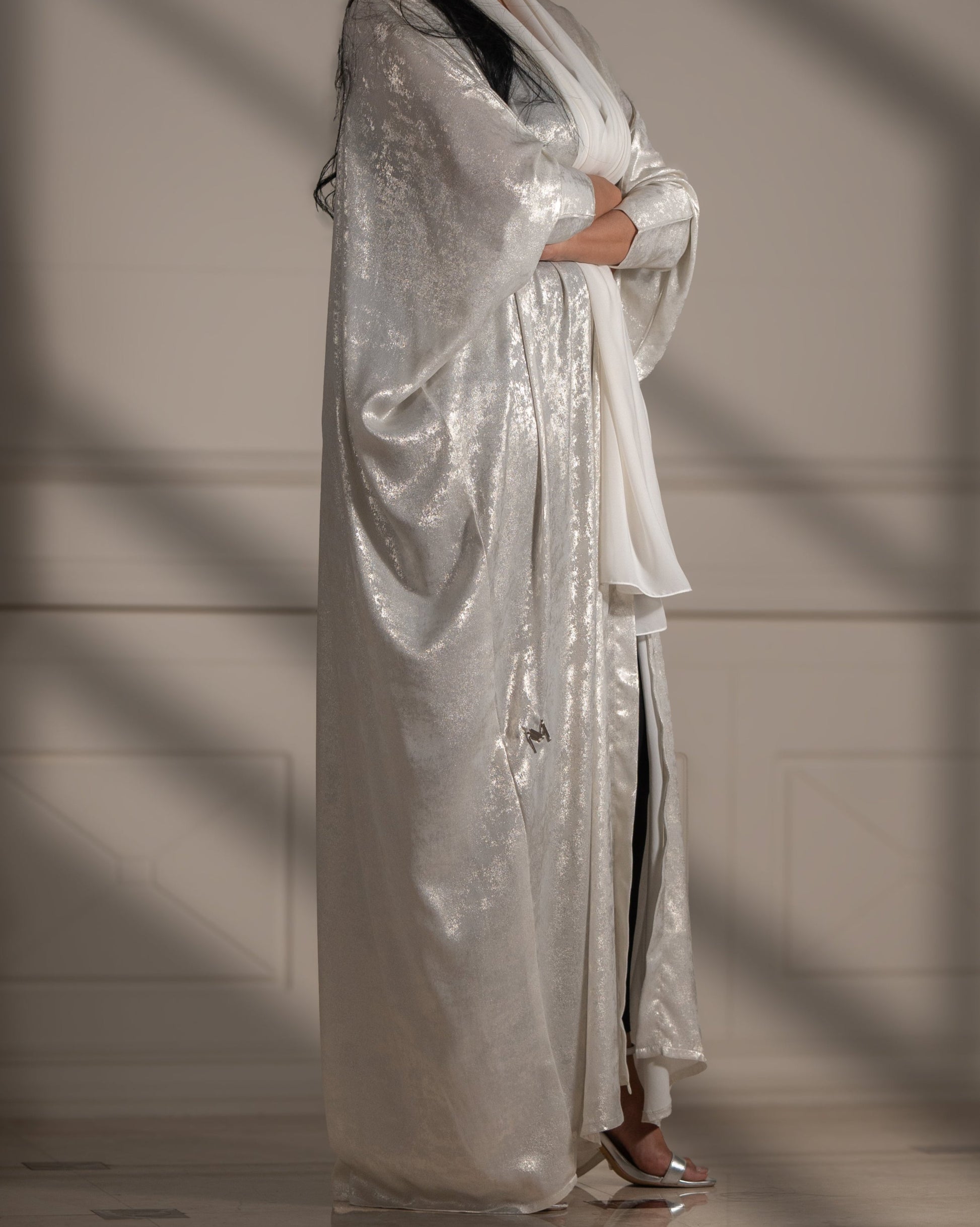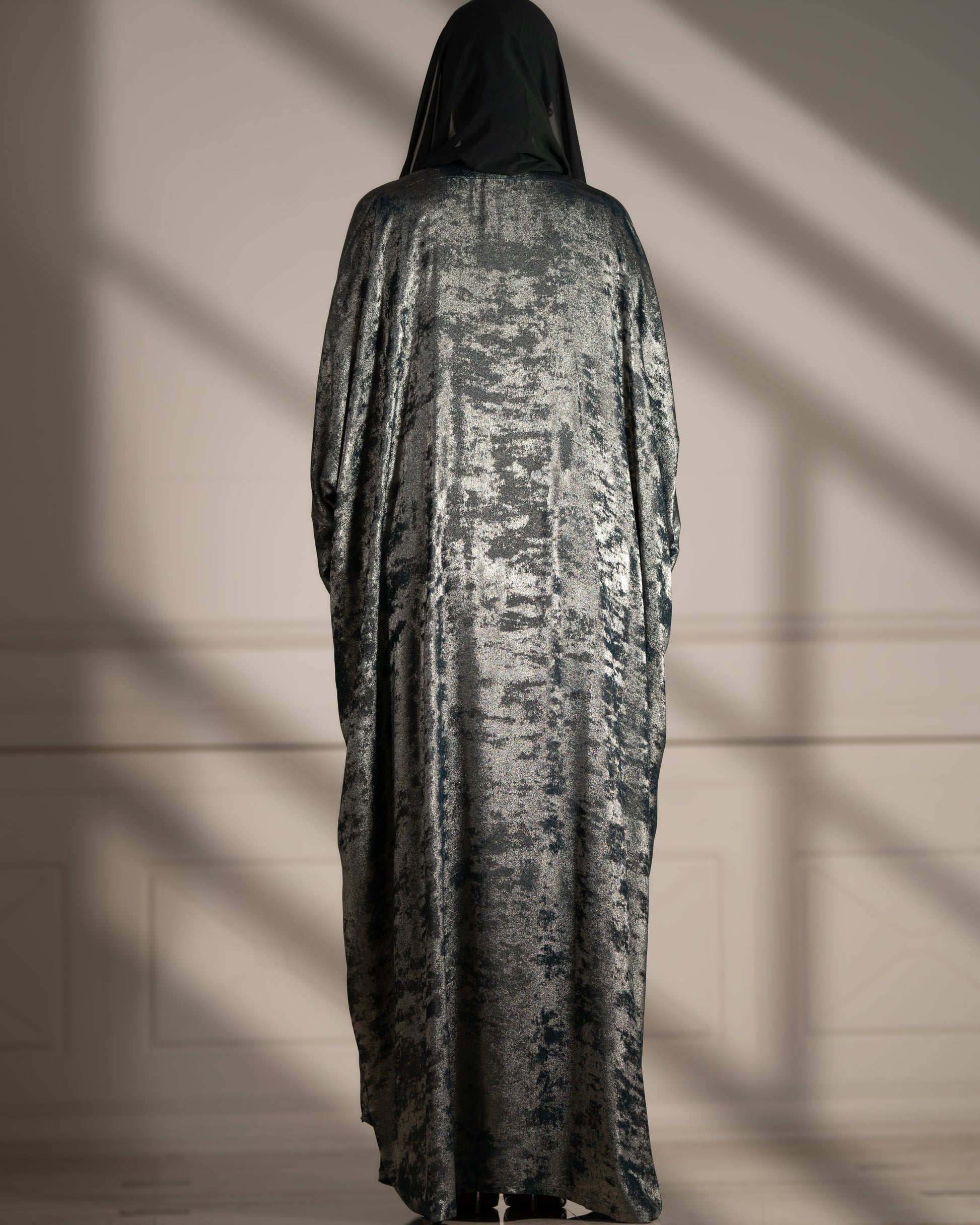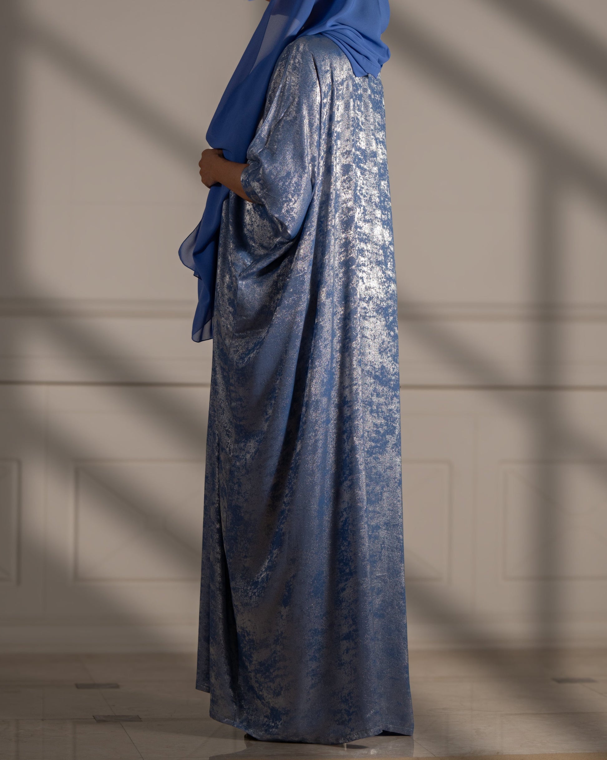 Step into refined luxury with the Lunar Majesty abaya, where shimmering fabric meets delicate floral artistry for a look that’s truly out of this world.