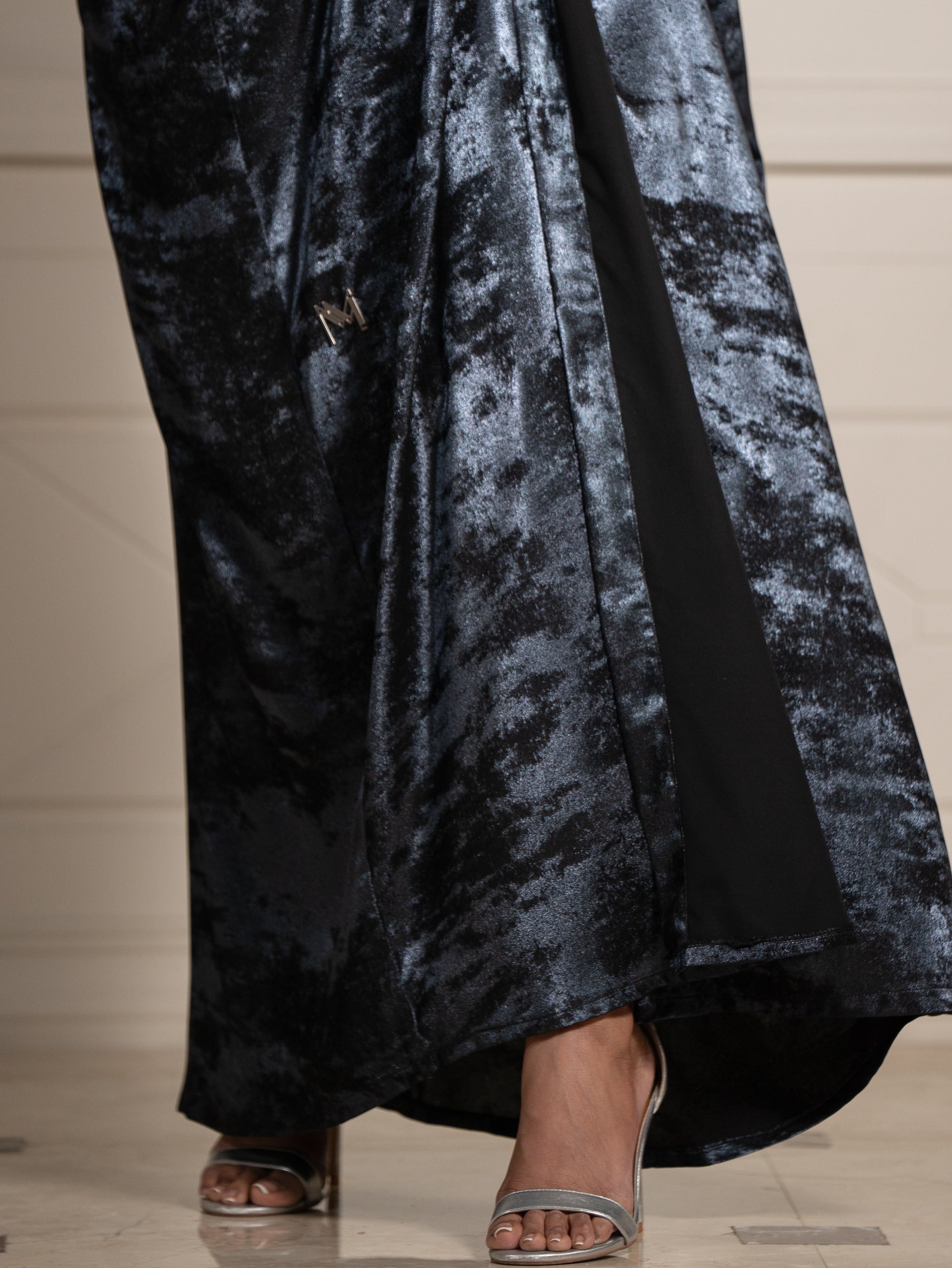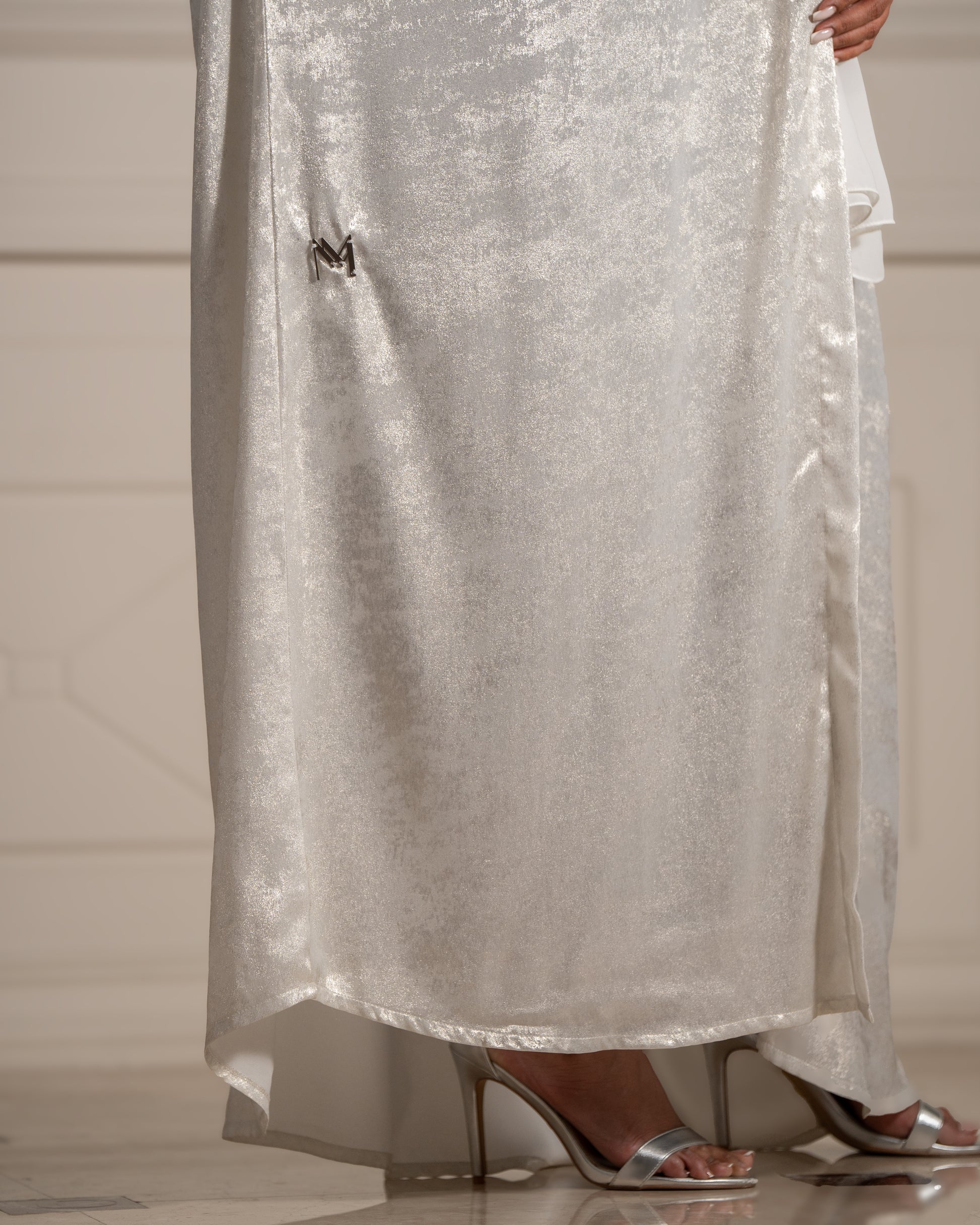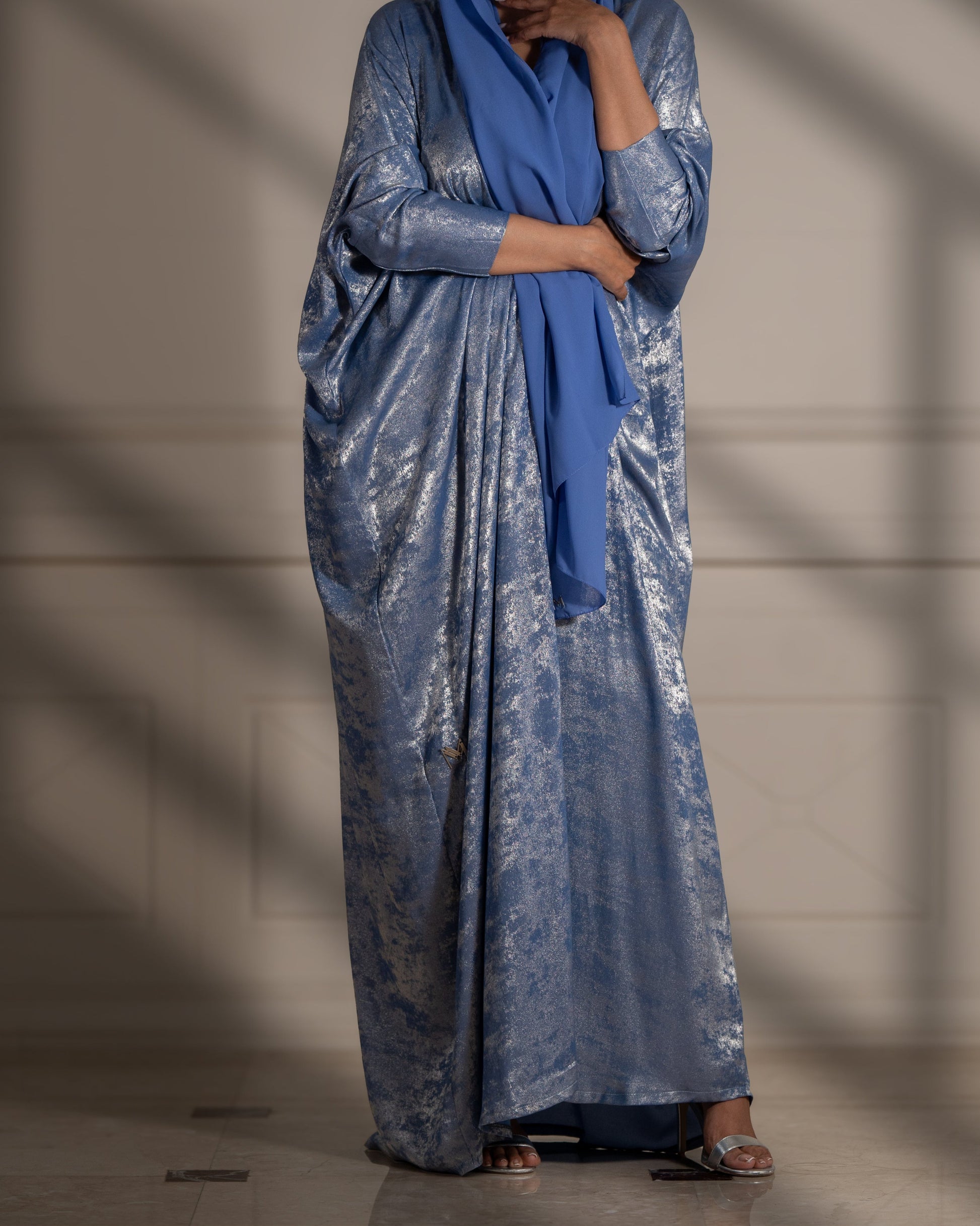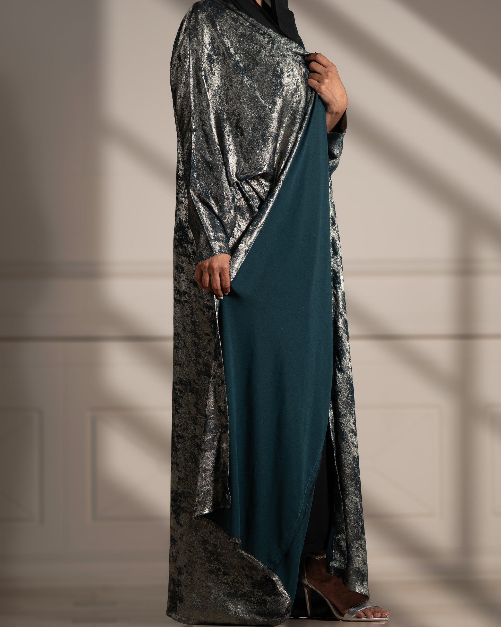 Step into refined luxury with the Lunar Majesty abaya, where shimmering fabric meets delicate floral artistry for a look that’s truly out of this world.