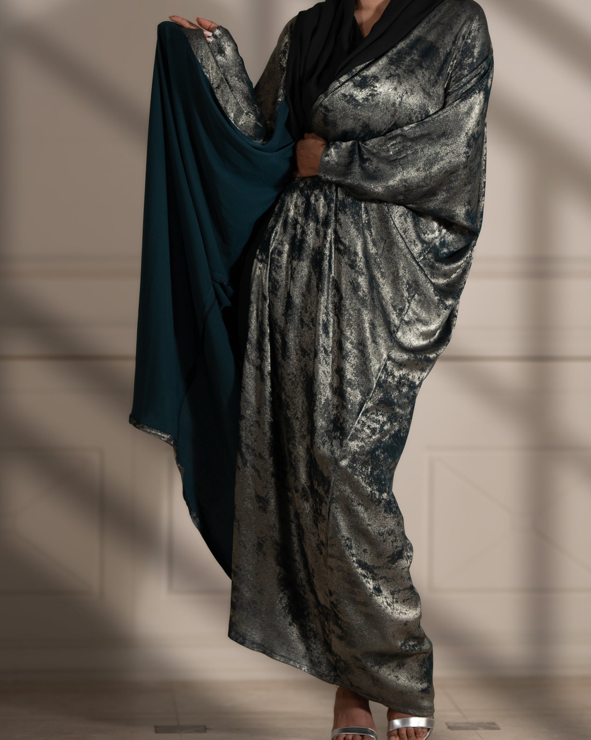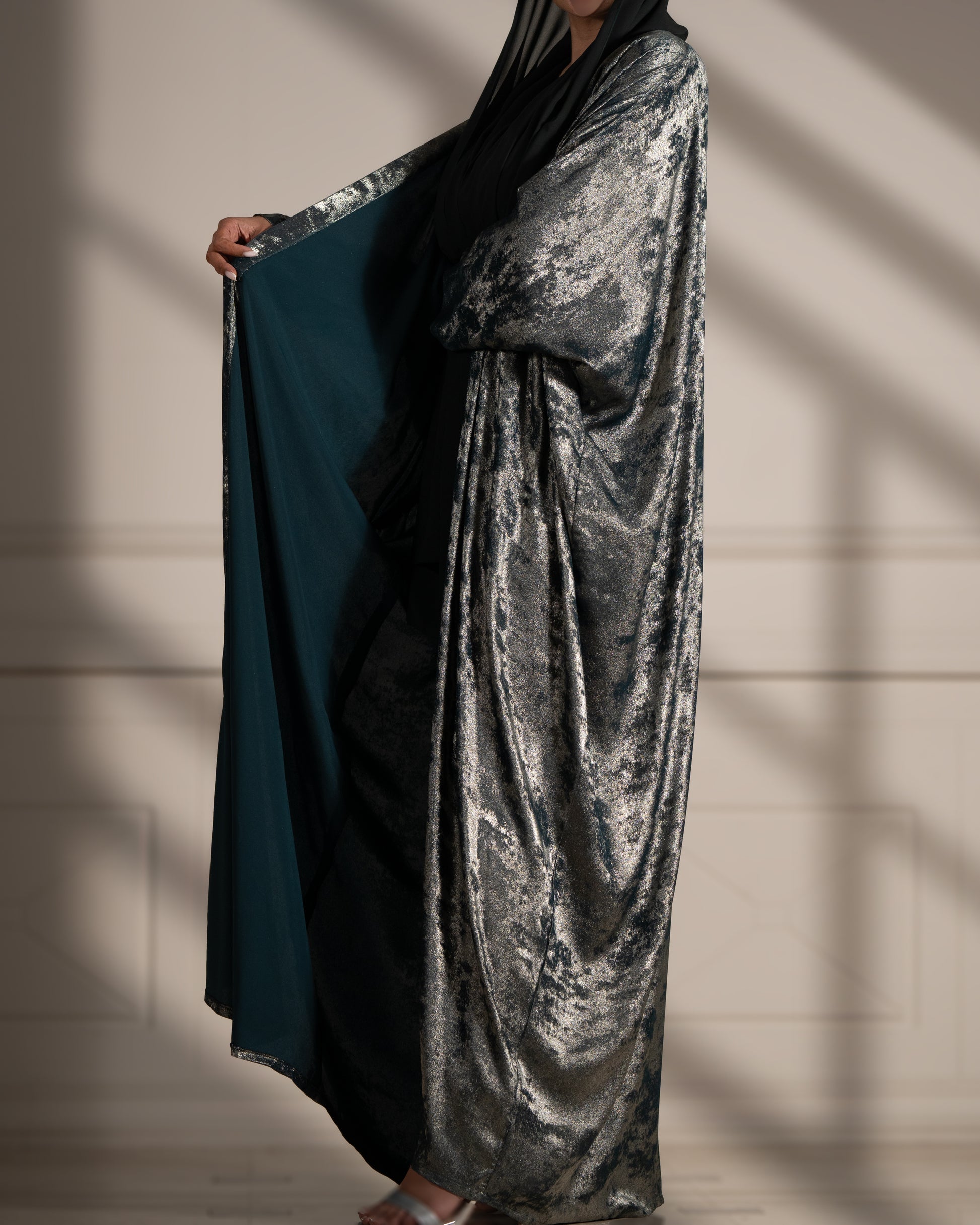 Embrace the beauty of moonlit elegance with the Lunar Majesty abaya, crafted from luxurious shiny fabric that reflects subtle light and adds a touch of radiance to your look. This stunning piece features a unique floral shade print, blending nature’s beauty with a modern twist. The smooth, flowing silhouette enhances your grace and sophistication, making it the perfect choice for special occasions or elevating your everyday style.